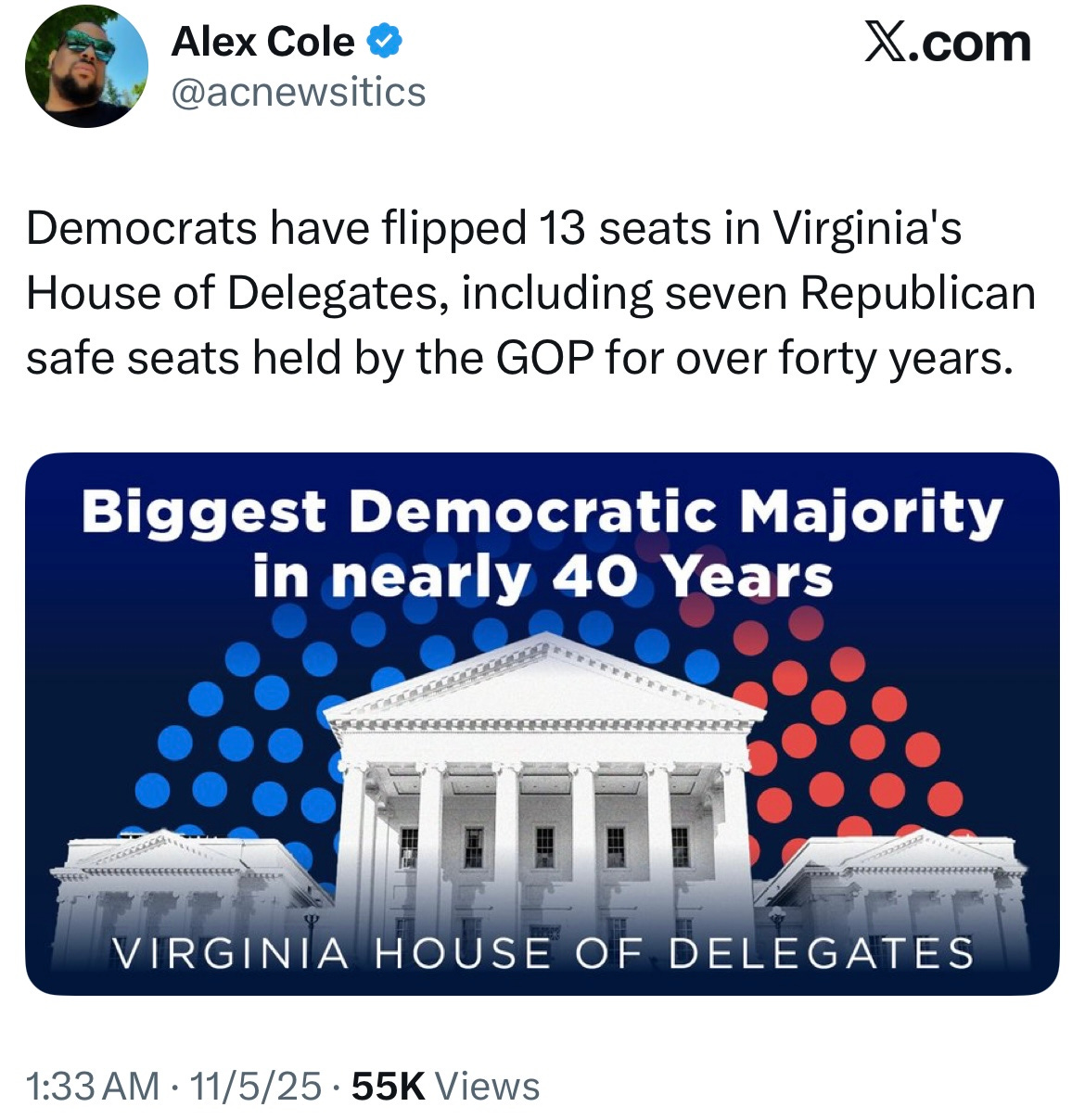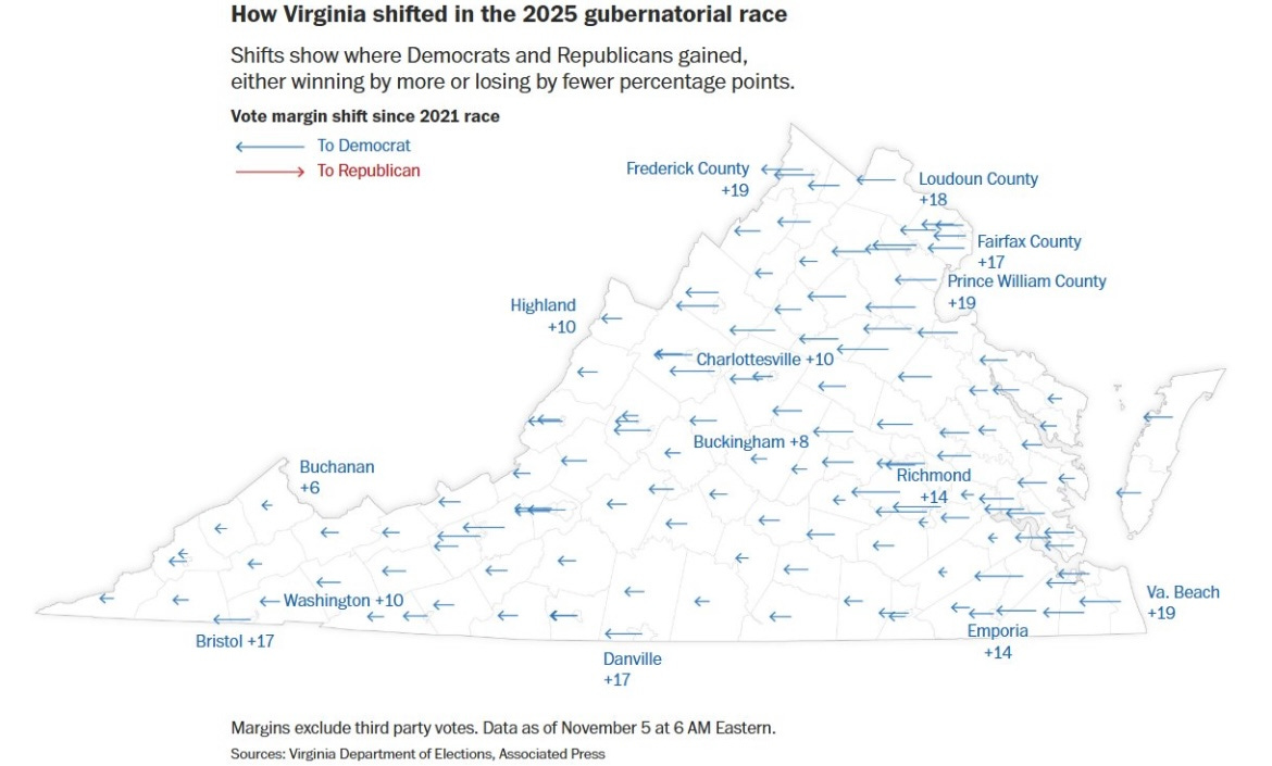 Voters moved toward Democrats in every corner of the state, and not only did Abigail Spanberger absolutely crush it for Governor, but the Democrats flipped 13 seats to get to a 64-36 majority.